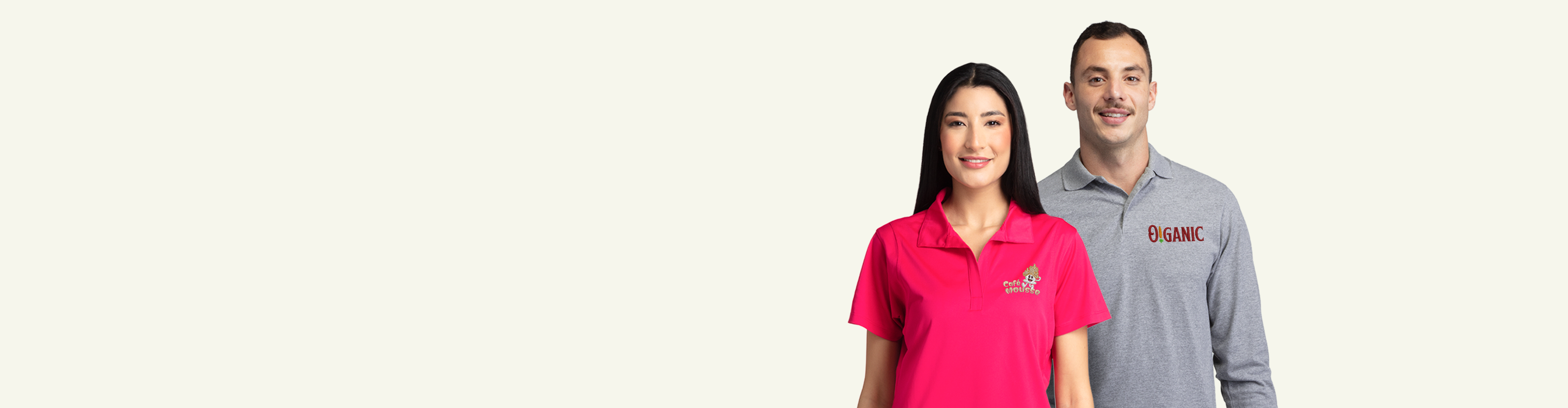 Two people wearing custom polo shirts while smiling.