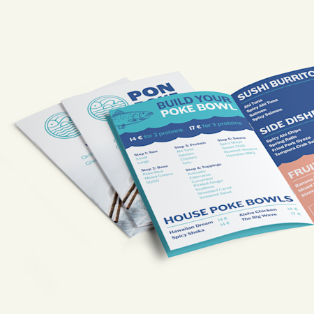 Flat menus are 210 x 95 mm sheets with customisable front and back sides. They're ideal for more selective menus or specials. Tri-fold menus are 93 x 216 mm (when folded) with 6 separate panels, leaving more room for restaurant info, photos and more.
