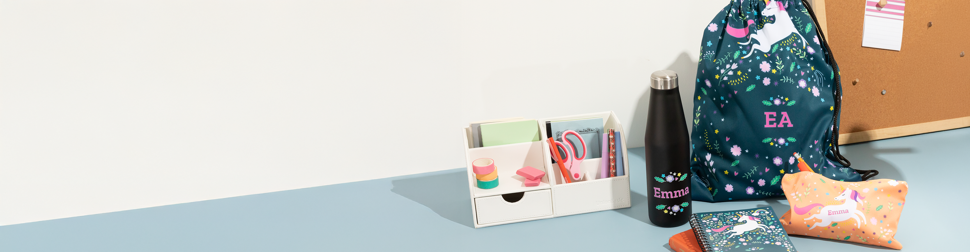 Personalised back-to-school supplies for kids and the classroom, from bottles and bags to stickers and stationery.