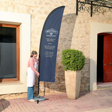 It depends on what you’re looking for. Banners are our most popular and versatile option and will last for 2–5 years depending on weather conditions and sun exposure. Our flags are also a good option for outdoor use if you have some floor space.
